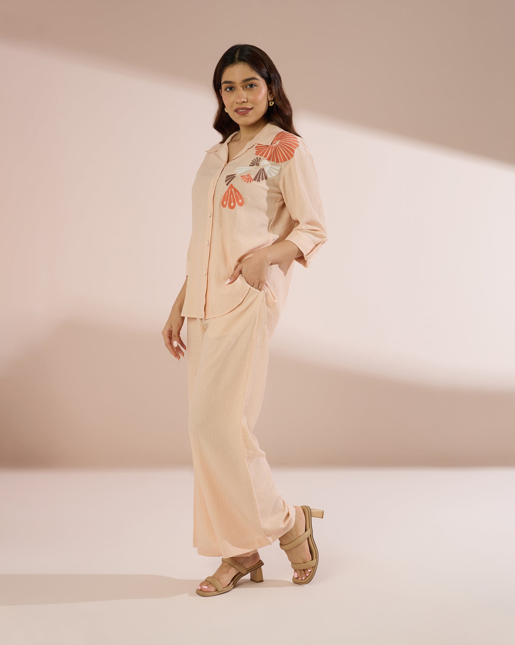The relaxed button-down top features delicate floral embroidery and a gentle collar, while the matching trousers fall straight and flow freely for ease of movement. Ideal for garden brunches, casual office looks, or relaxed weekends — this set blends comfort and charm in one cohesive look.
