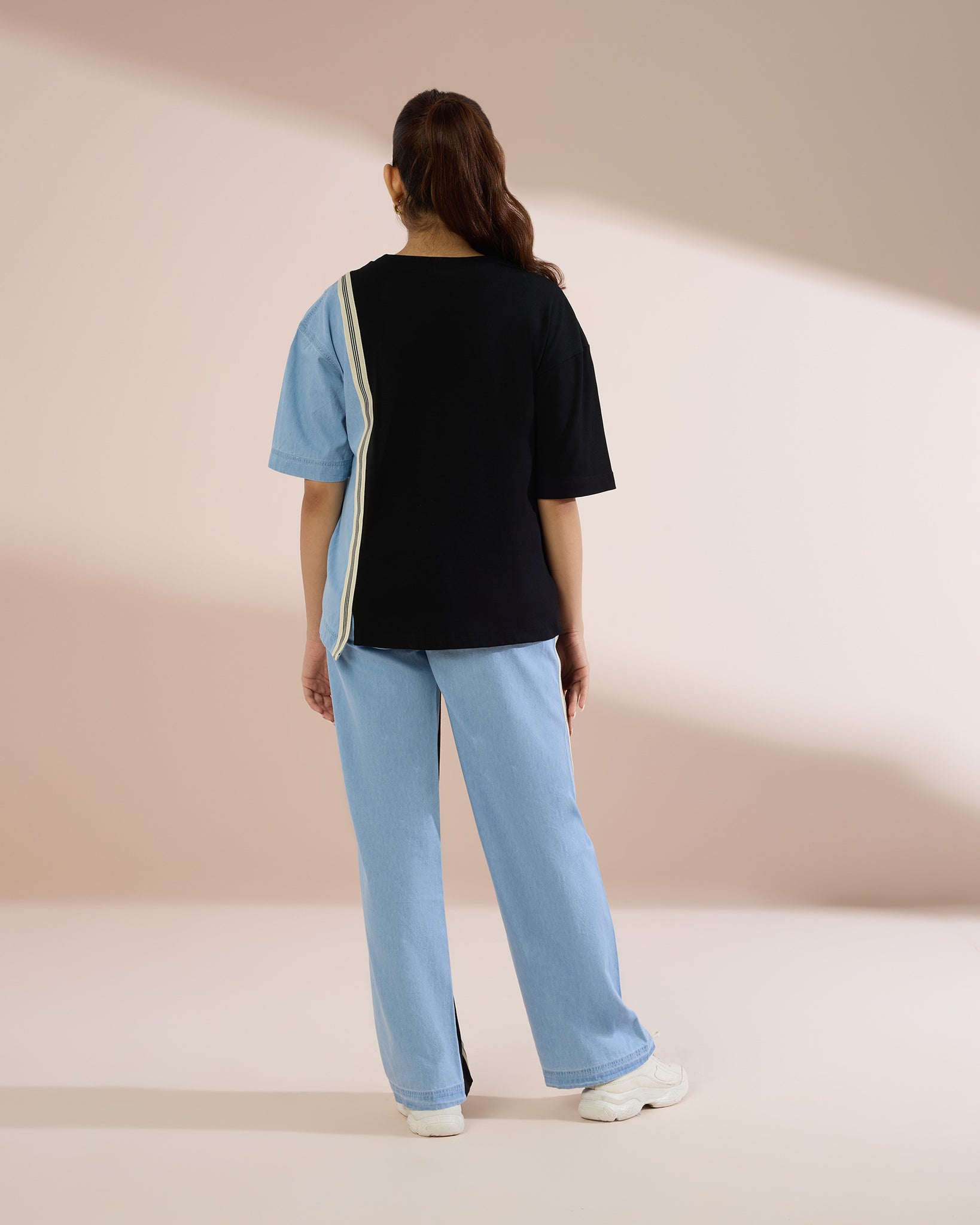 Designed in a soft, denim-textured fabric, this set features a relaxed-fit, shirt with a striking asymmetric hemline and contrast panel detailing. Paired with wide-leg trousers, it brings structure and ease together in one effortless look.