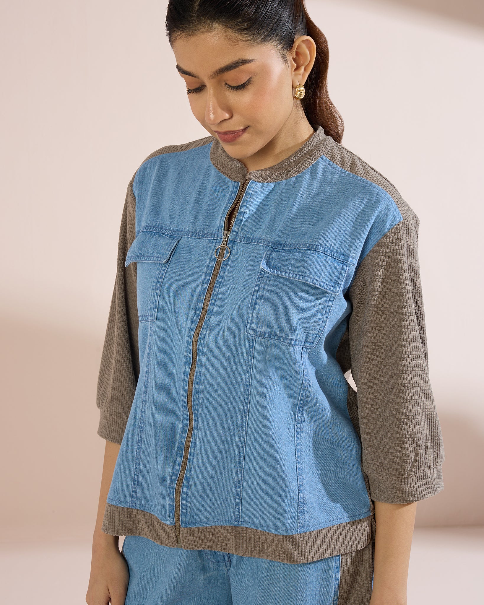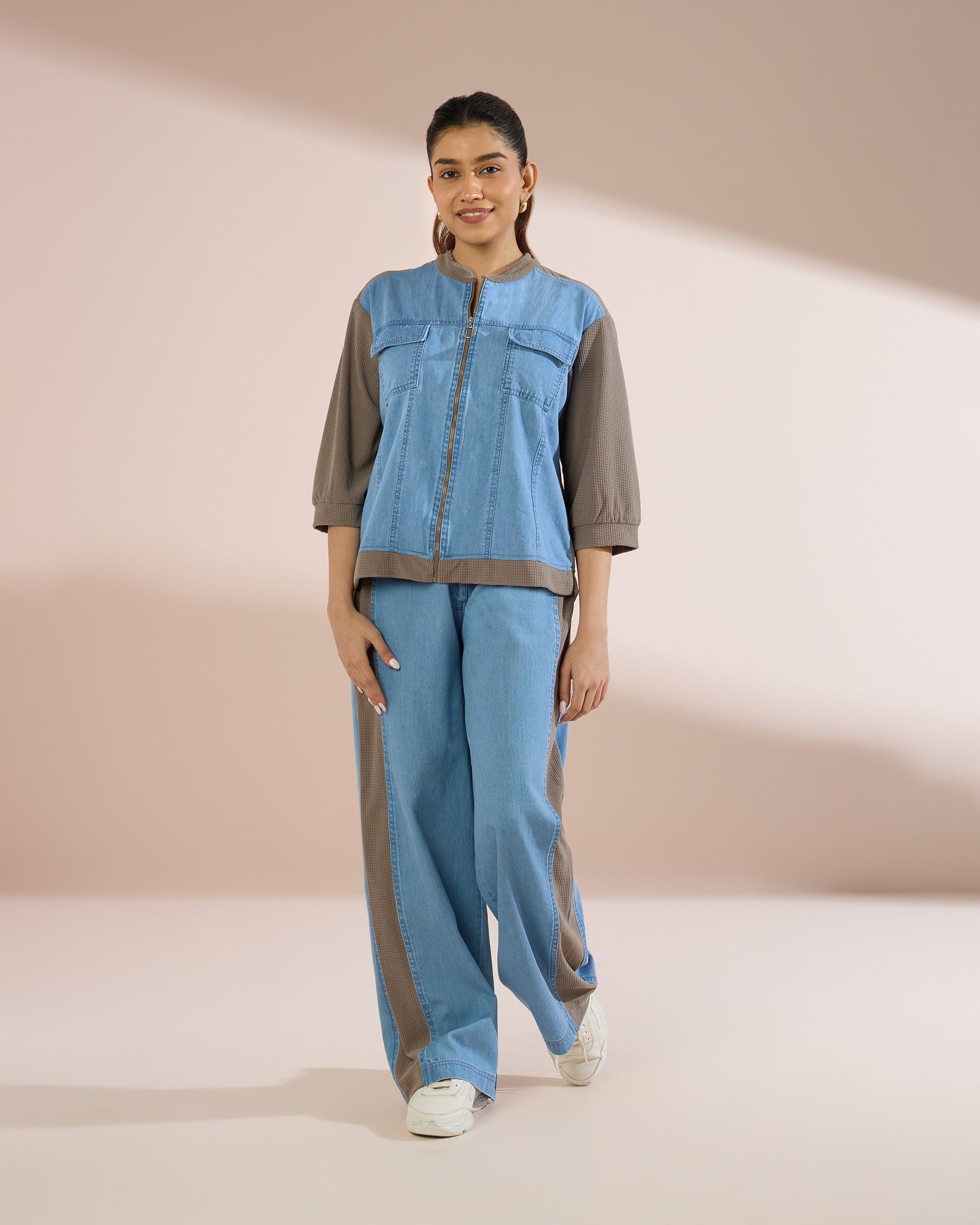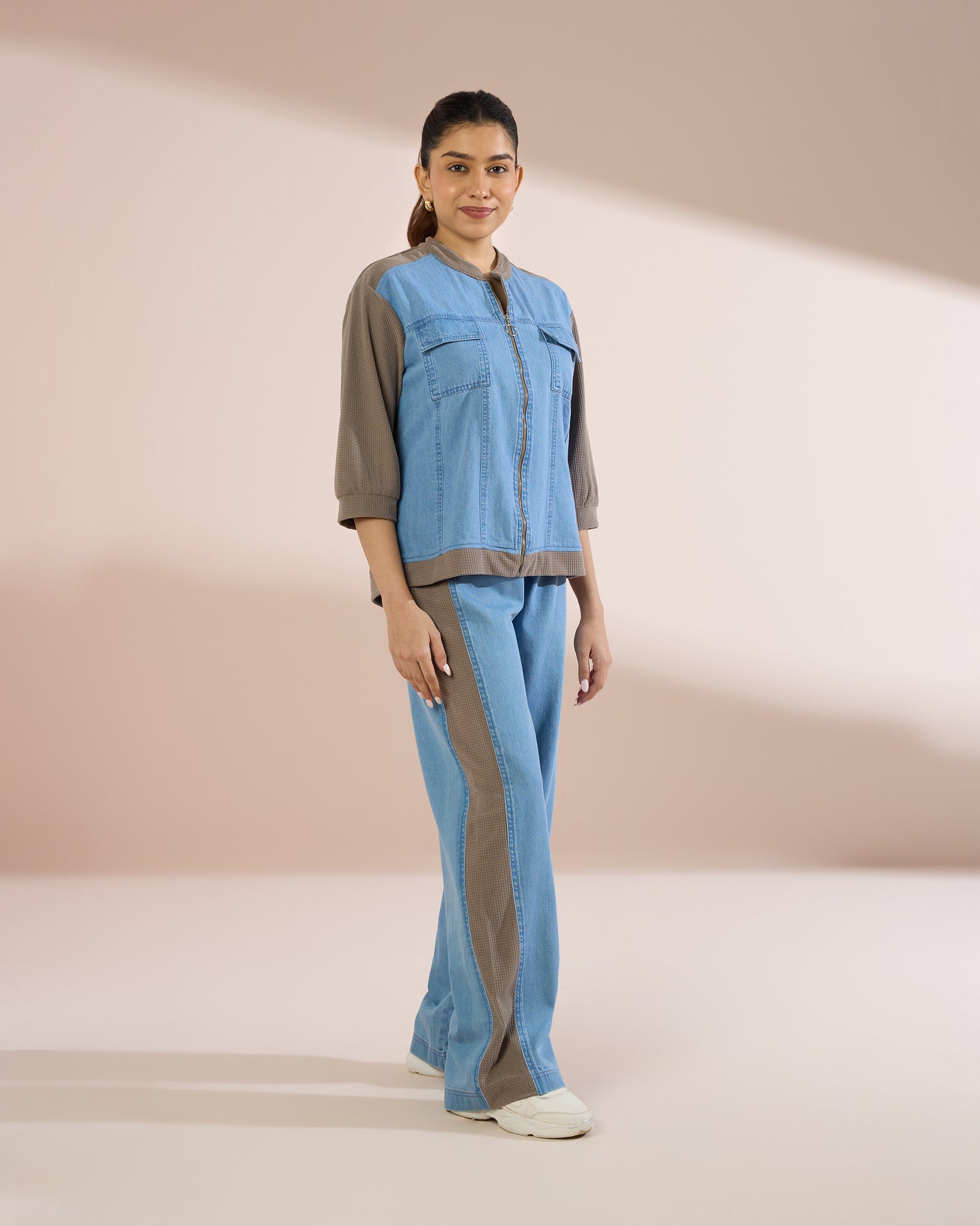 A stylish fusion of texture and contrast, this dual-fabric zip-front shirt features a structured denim front with flap pockets, balanced by soft waffle-knit sleeves and side panels. Paired with relaxed denim trousers, this set delivers a modern utility-inspired look that’s equal parts comfort and cool.