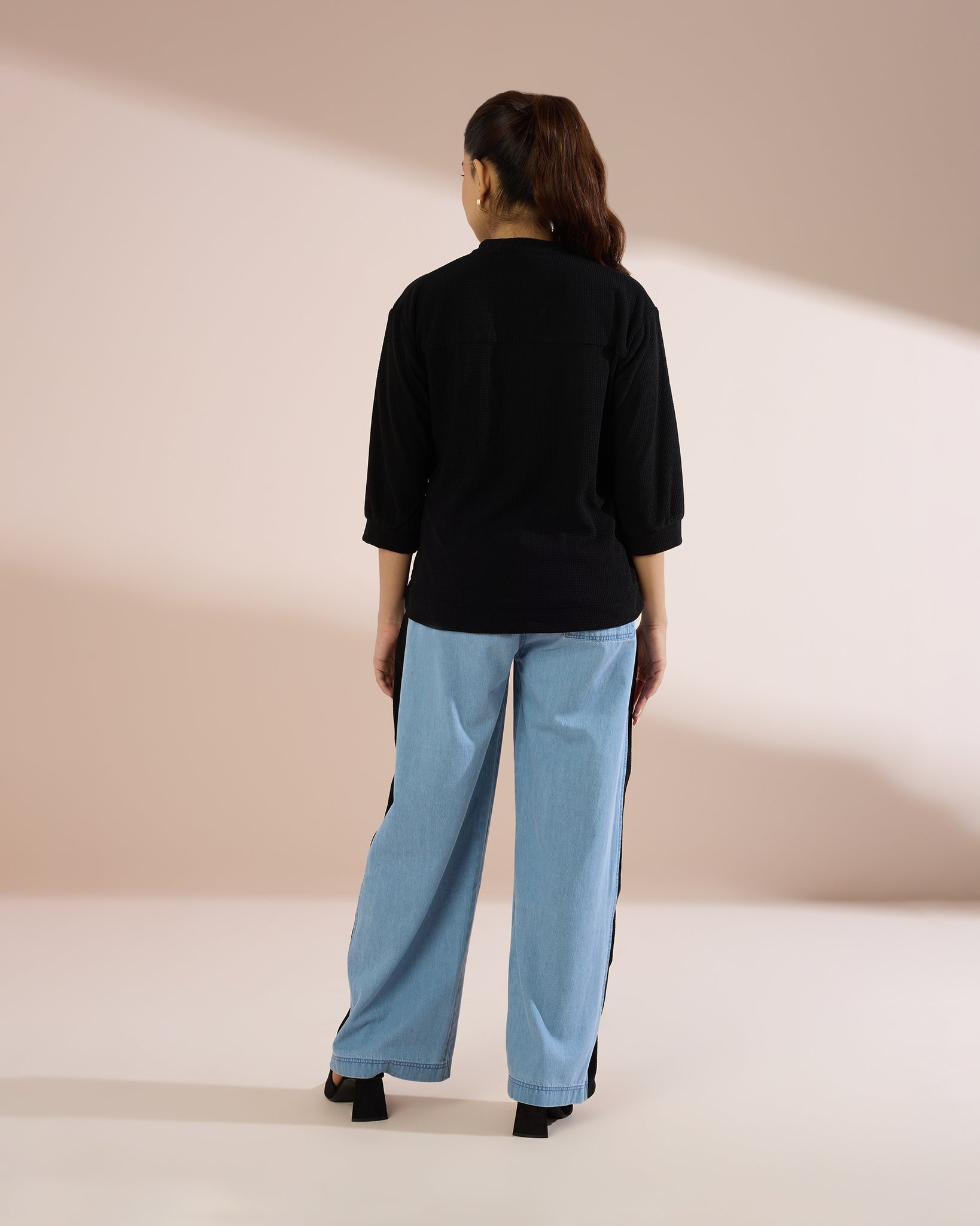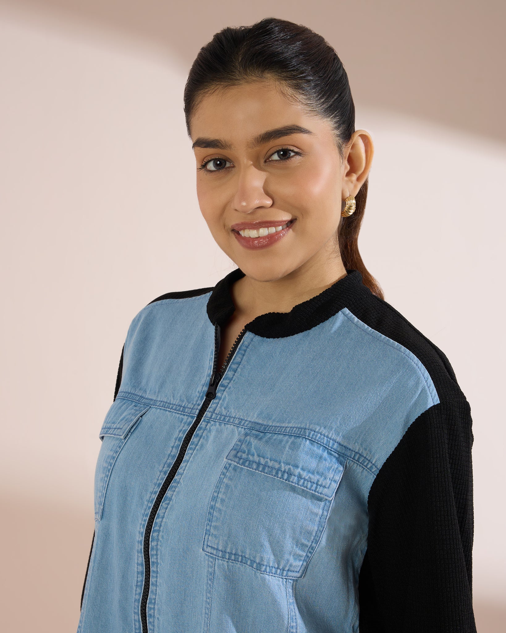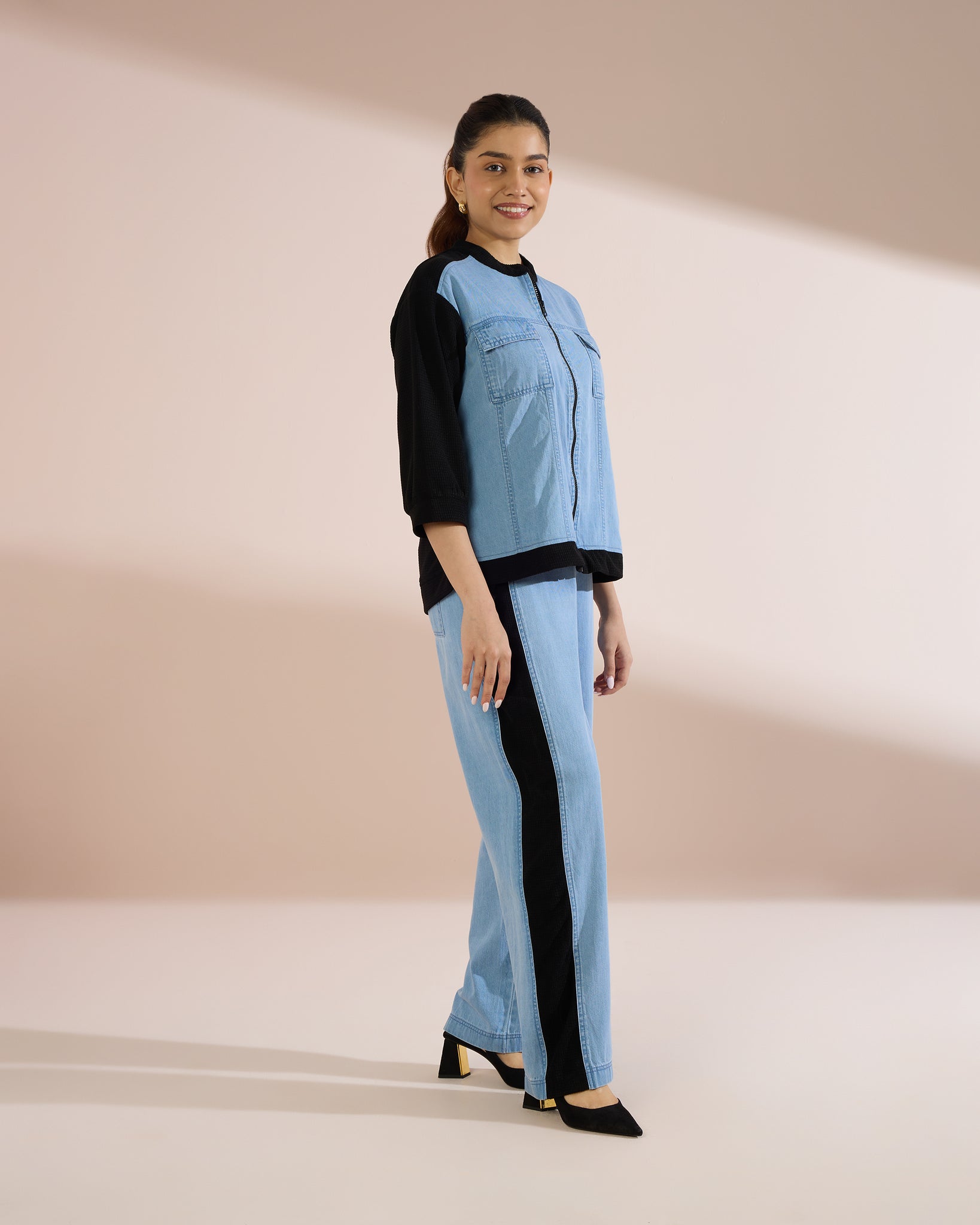 A stylish fusion of texture and contrast, this dual-fabric zip-front shirt features a structured denim front with flap pockets, balanced by soft waffle-knit sleeves and side panels. Paired with relaxed denim trousers, this set delivers a modern utility-inspired look that’s equal parts comfort and cool.