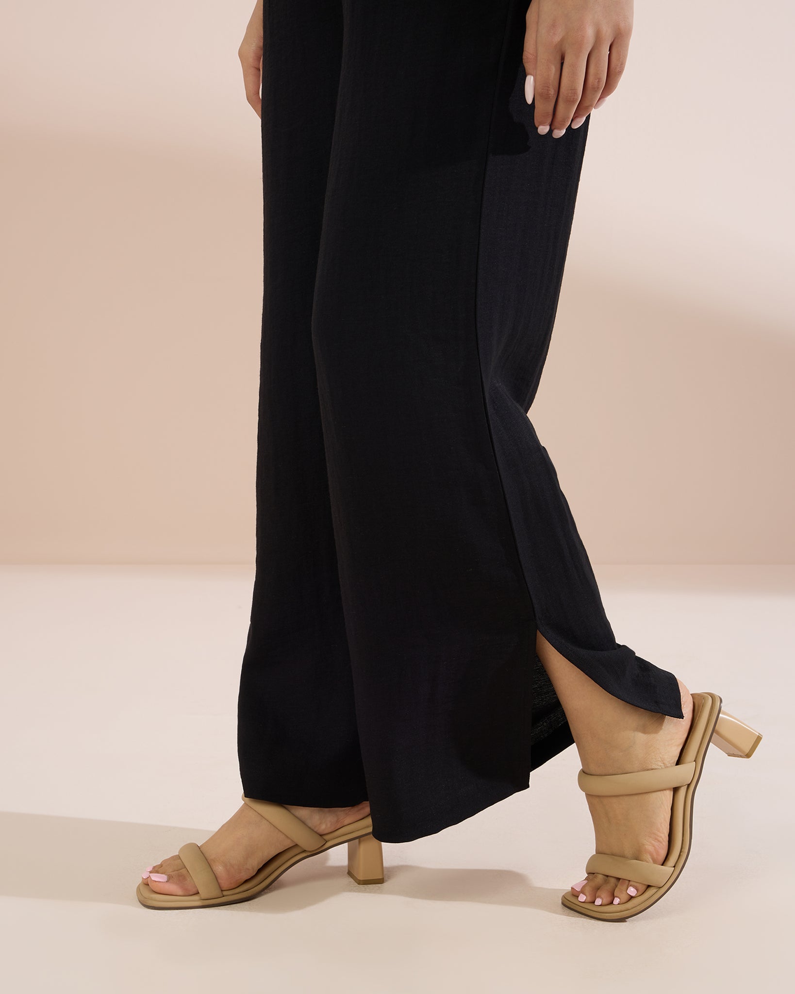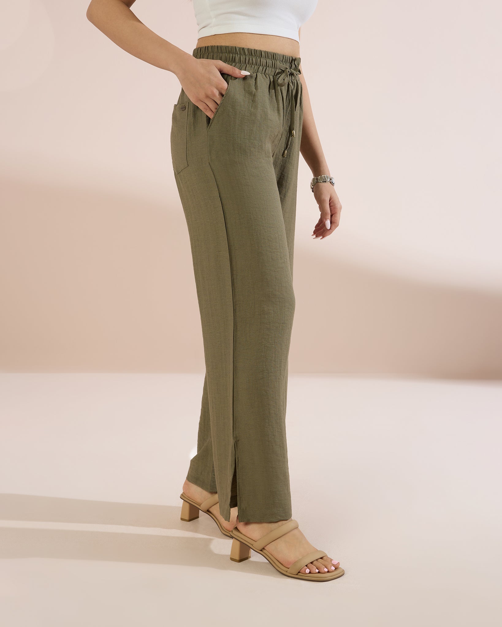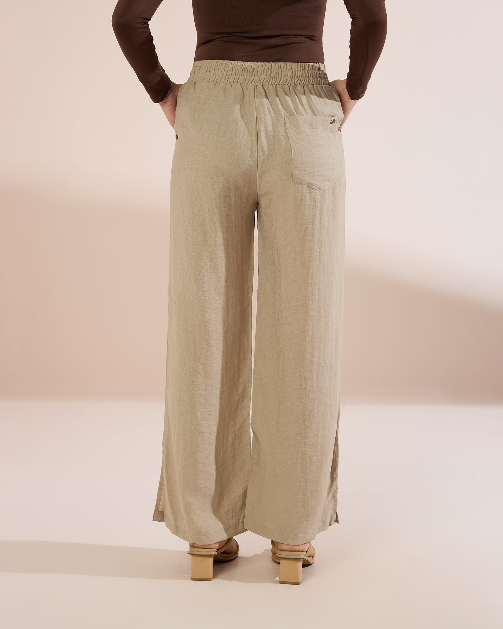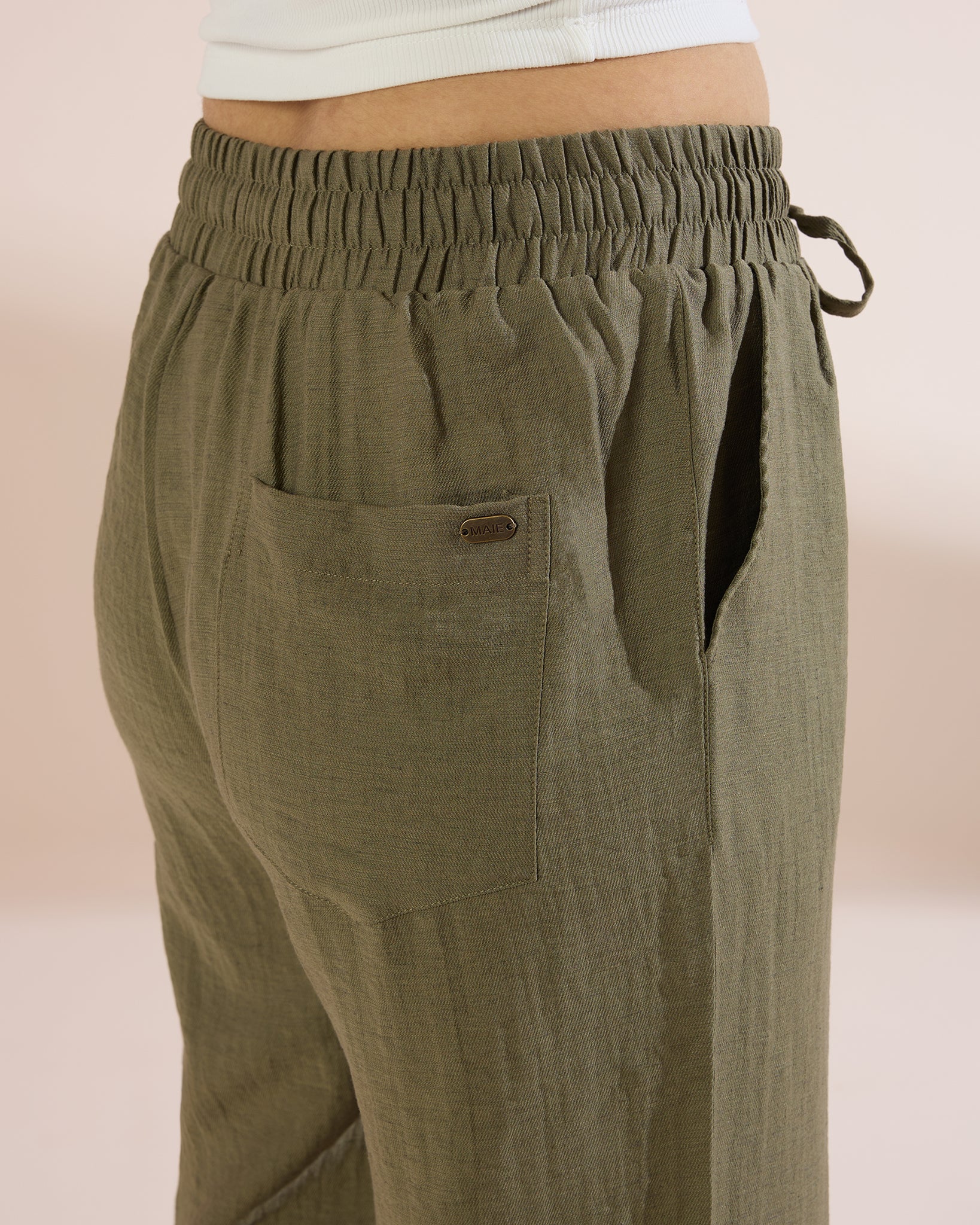 Relaxed-fit wide-leg trousers crafted from a breathable linen-blend fabric. Designed with a gathered elastic waistband and an adjustable drawstring, these pants offer all-day comfort with a flattering drape. Featuring subtle side slits at the hem, this laid-back silhouette pairs perfectly with fitted tops and sandals for an elevated off-duty look.