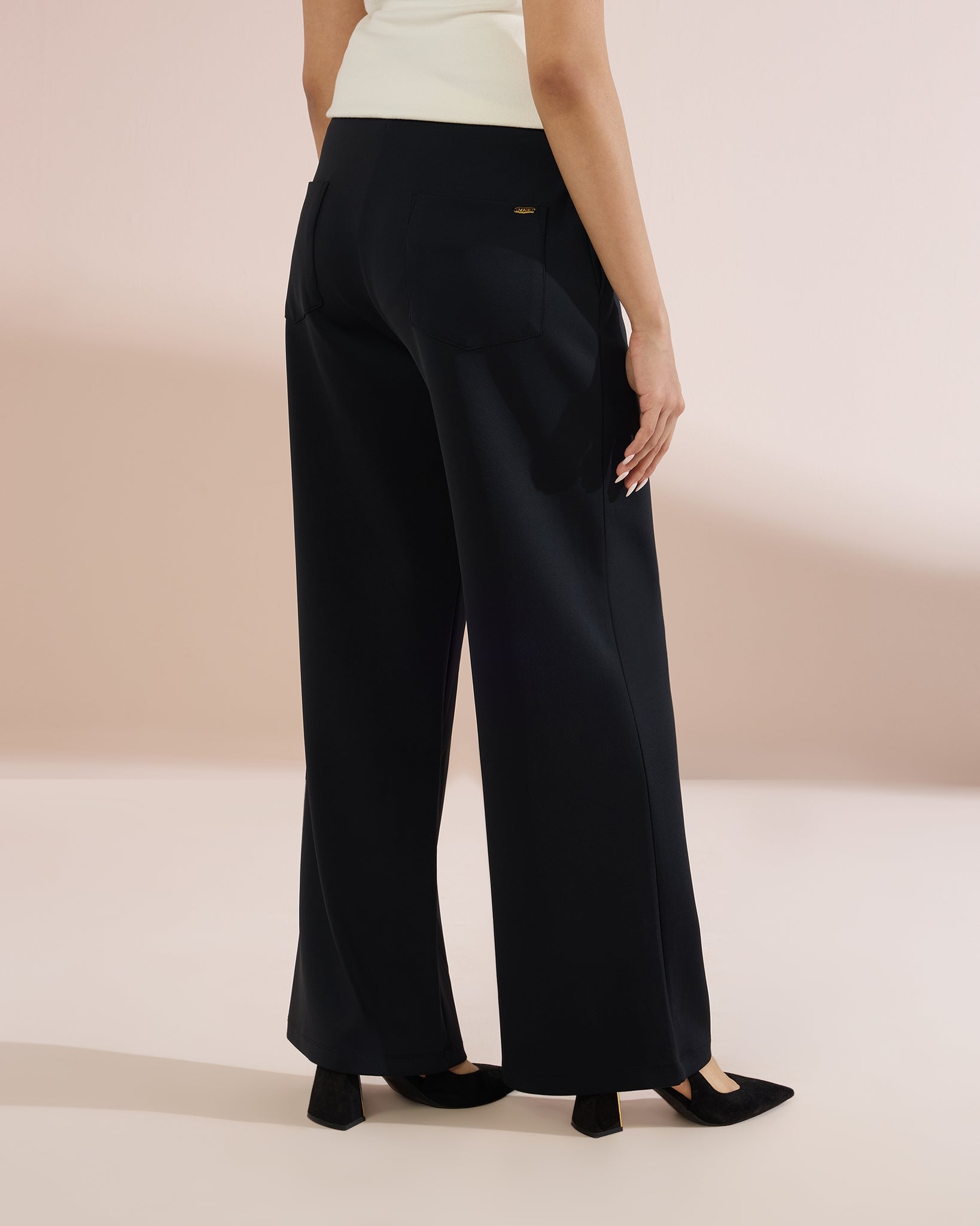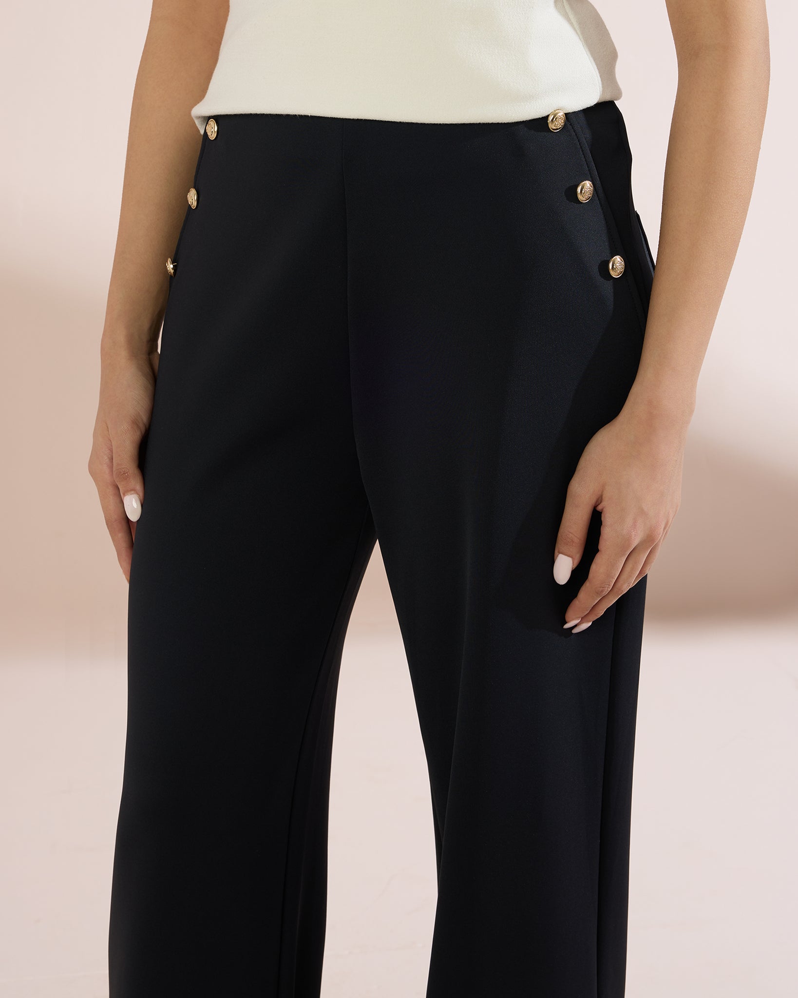 High-waisted wide-leg trousers, featuring a chic sailor-inspired button detail on both sides of the waist. Crafted from a structured, stretch-knit fabric, these trousers offer a flattering silhouette that skims the body and flares out at the hem for a sophisticated touch. Perfect for desk-to-dinner dressing, pair them with cropped tops or tucked-in blouses for a polished look.