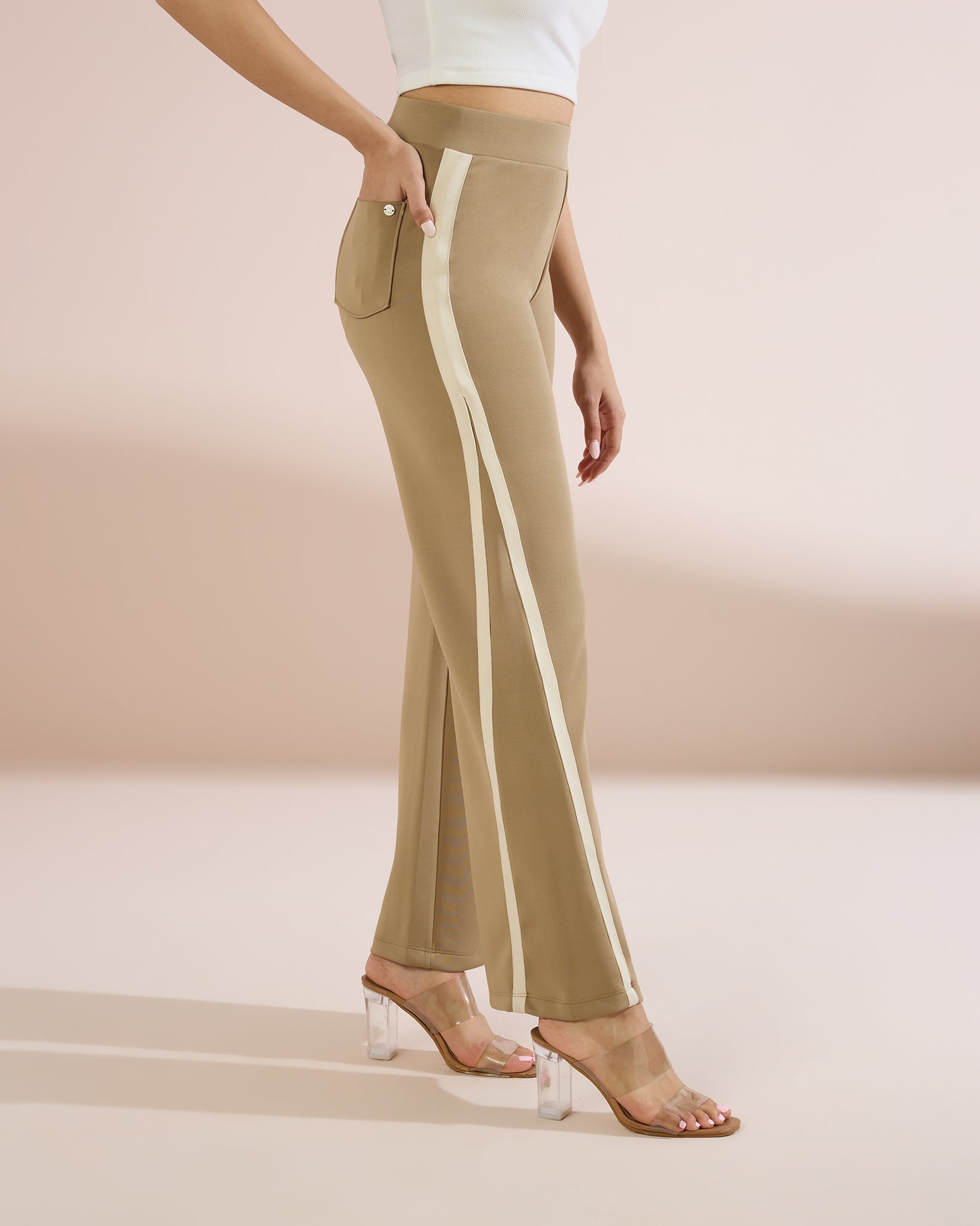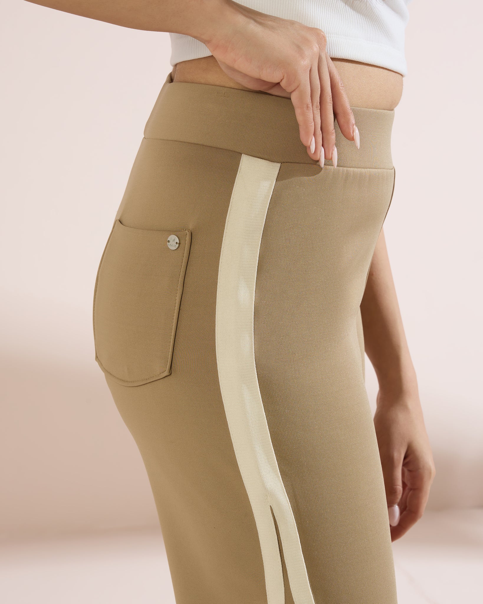 A sleek yet relaxed wide‑leg pant featuring a high waistband for comfort, accented with a contrasting side stripe that elongates the silhouette. The design includes slits at the hem and side pockets for utility and style. Crafted in a stretch‑knit / viscose blend fabric that drapes fluidly while maintaining structure, this pant is perfect for casual chic or elevator‑to‑dinner dressing.